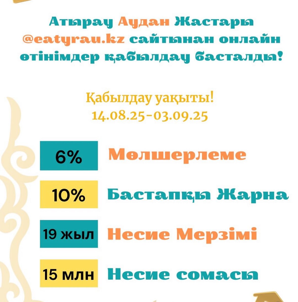 Өтініш қабылдау мерзімі - осы жылдың 14 тамызы мен 3 қыркүйегі аралығы, деп хабарлайды AtyrauPress тілшісі.