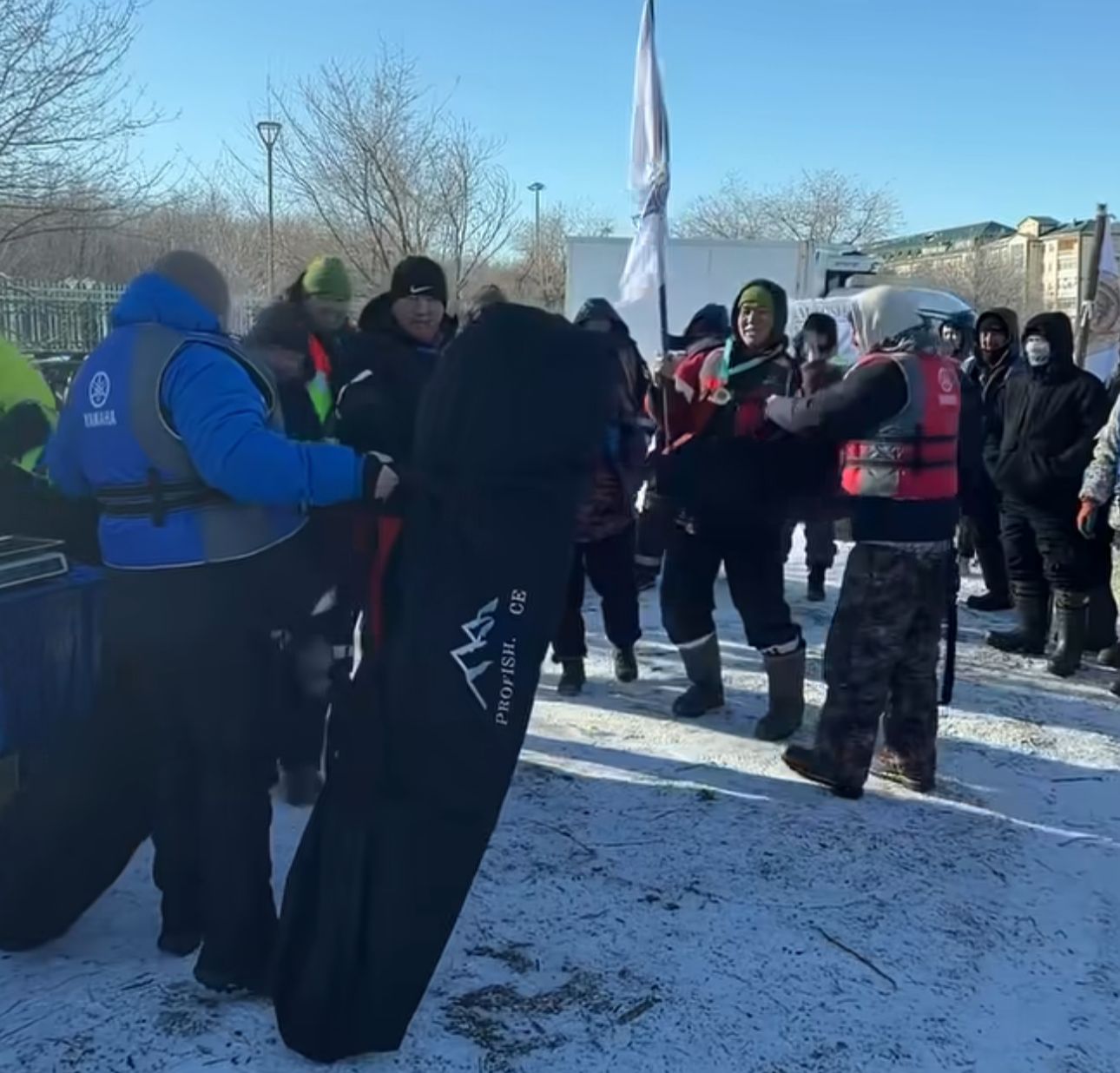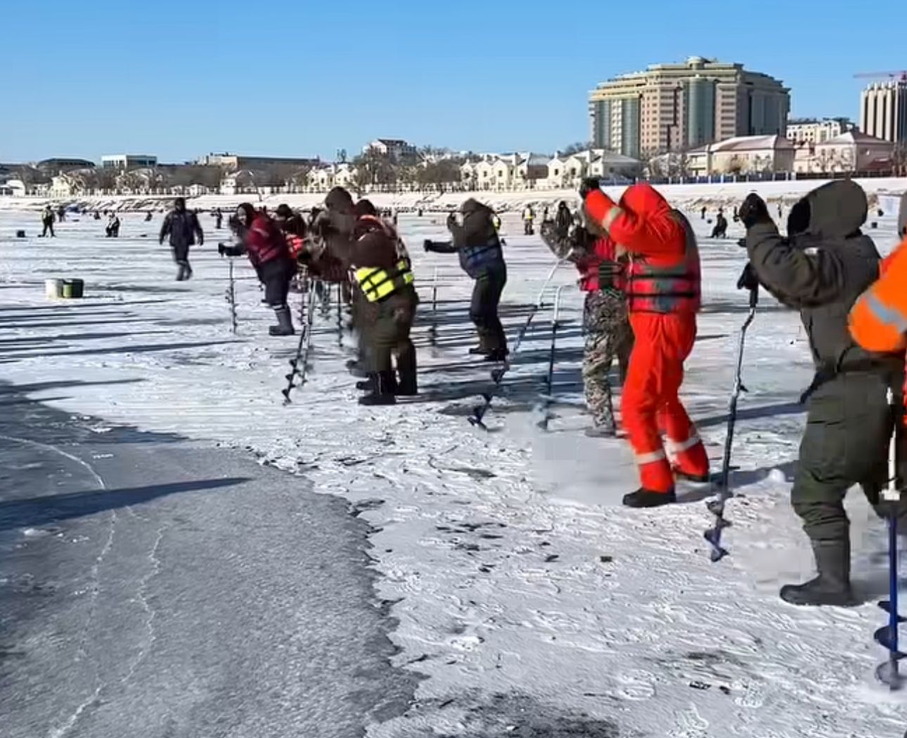 В турнире приняли участие около 60 рыбаков, объединившихся в команды. Участники выстроились вдоль берега, демонстрируя навыки зимней ловли в условиях строгого регламента.